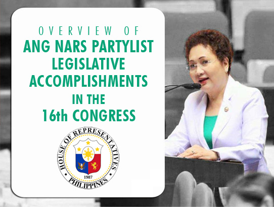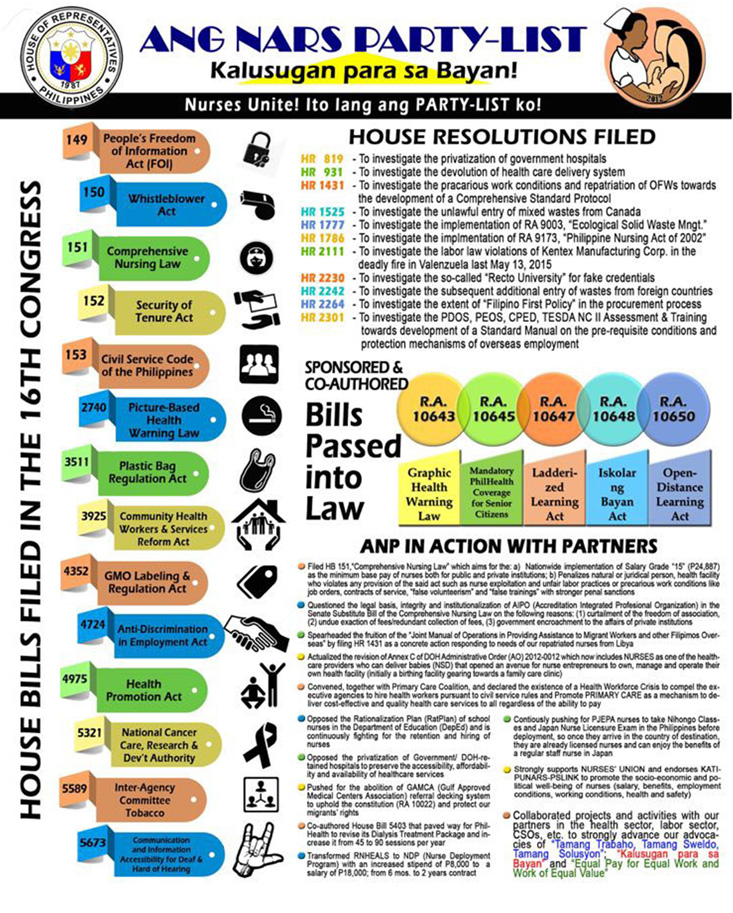 In the 16th Congress, ANG NARS Party-list takes pride in its legislative accomplishments and other milestones in its 3 years stint as the representative of nurses, health workers and health of every Filipino.