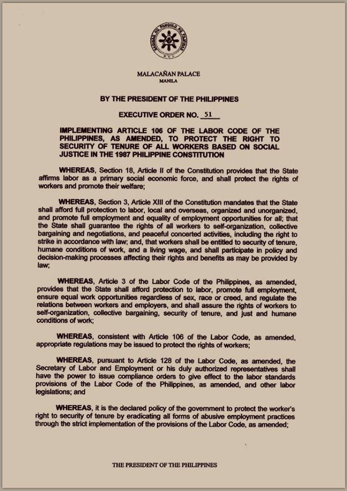 IMPLEMENTING ARTICLE 106 OF THE LABOR CODE OF THE PHILIPPINES, AS AMENDED, TO PROTECT THE RIGHT TO SECURITY OF TENURE OF ALL WORKERS BASED ON SOCIAL JUSTICE IN THE 1987 PHILIPPINE CONSTITUTION [Source: www.officialgazette.gov.ph]