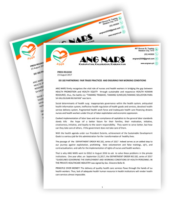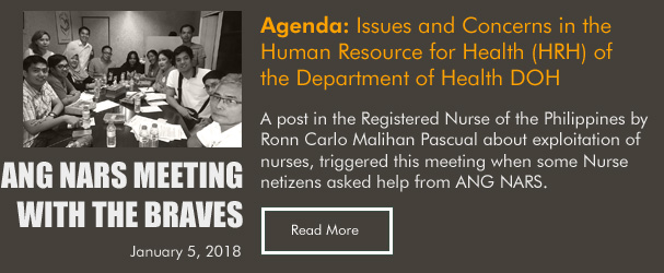 ANG NARS is a non-stock, non-profit organization with SEC No. CN200900208. ANG NARS was founded in 2009 for ensuring and promoting the socio-economic-political-professional RIGHTS of nurses with the responsibility to provide safe quality nursing care to the Filipinos (Kalusugan Para sa Bayan).